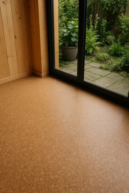 Cork flooring is made from the bark of cork oak trees, pressed into tiles or planks. It’s lightweight, cushioned, and can trap heat. If you spend hours in your garden room working or relaxing, you might want to consider this.