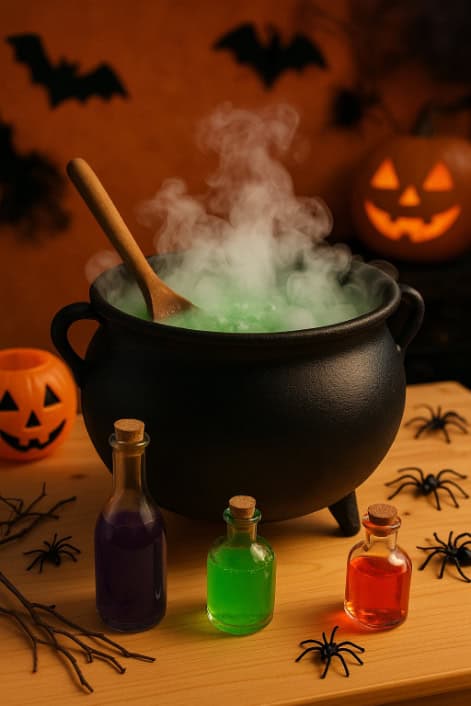 Don’t forget the plastic cauldron and a wooden spoon for stirring. Even better, with a little smoke effect using a cup of warm water and a bit of dry ice – with your supervision, of course.